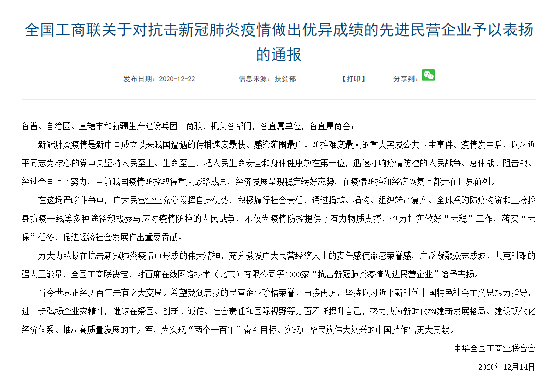 近期,中华全国工商业联合会对抗击新冠肺炎疫情做出优异成绩的先进民营企业予以表扬,江苏乾宝生物科技有限公司荣登榜单。