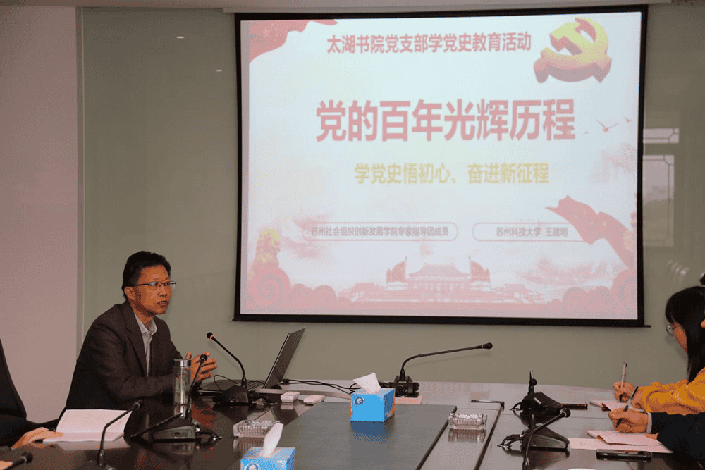 为深入学习*习*近*平*总书记在党史学习教育动员大会上的讲话精神,认真贯彻落实中央和省委、市委、以及市社会组织党委关于党史学习教育活动的实施方案,4月1日上午,太湖书院党支部开展“党的百年辉煌——学党史,悟初心”学党史专题教育活动,由党史学习教育市委宣讲团成员、苏州科技大学马克思主义学院教授王建明同志进行宣讲,原党支部书记丘亮辉、新一届党支部书记刘斌,以及支部党员和入党积极分子踊跃参加。
